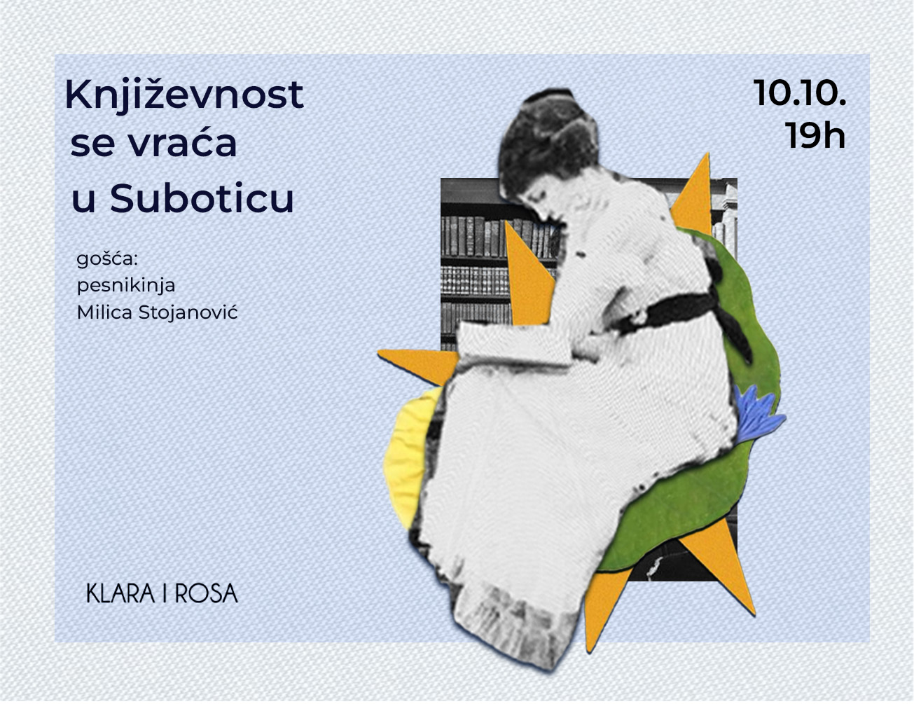 U četvrtak, 10. oktobra od 19 časova, u prostoru Klare i Rose (Petefi Šandora 15) nastavljamo ciklus „Književnost se vraća u Suboticu“. Ovog puta gošća je Milica Stojanović i predstaviće svoju prvu zbirku pesama pod nazivom „Hleba i cigara!“